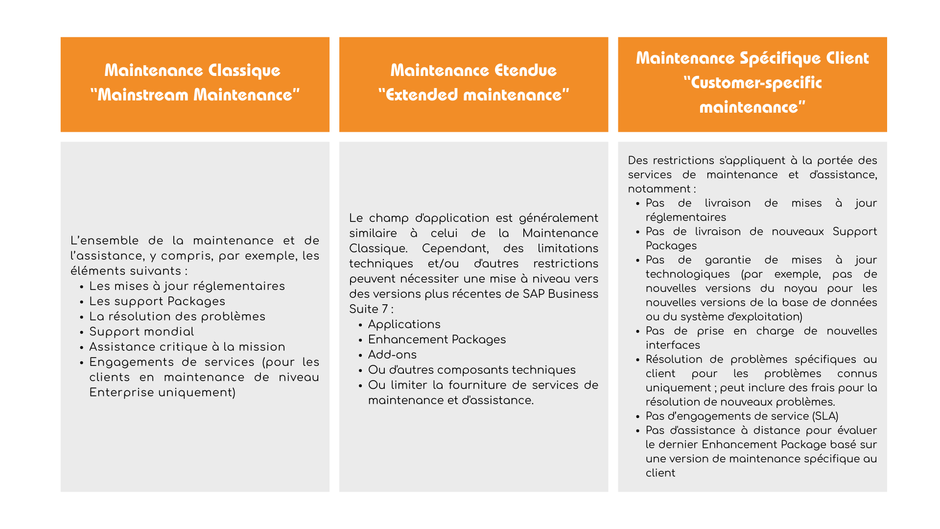 Les clients ECC6 disposant d’un EHP 0 à 5 ne pourront pas bénéficier de la Maintenance Etendue. Ils basculeront automatiquement (aucun avenant à signer) en Maintenance Spécifique Client (Customer-Specific Maintenance) au 1er janvier 2026.