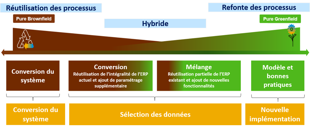 Migration technique (Brownfield) : rapide et économique, utilisation des outils de migration fournis par SAP pour migrer les objets SAP ECC6 vers S/4HANA. L’objectif est d’effectuer une migration technique à iso-périmètre fonctionnel.