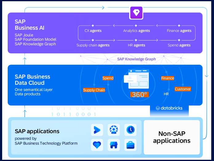 L’intégration entre SAP Business AI et SAP BDC peut être comprise comme une architecture à plusieurs niveaux :