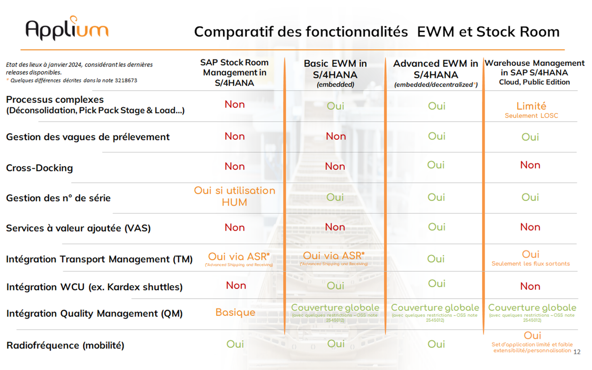 Dans le cadre d’une transition vers S/4HANA, le déploiement de SAP EWM est ainsi plus judicieux grâce à sa couverture fonctionnelle plus étendue et car l’absence de roadmap sur SAP Stock Room Management offre des perspectives à long termes moins intéressantes (voir note OSS 288116).