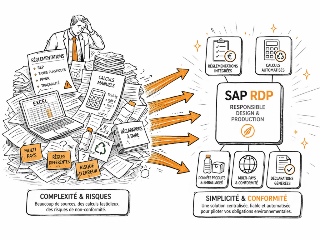 La solution SAP Responsible Design and Production (RDP) permet de répondre à ces enjeux en intégrant directement les exigences réglementaires dans les processus métier et dans les systèmes SAP existants.